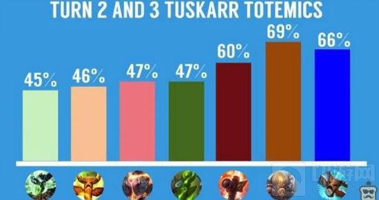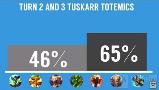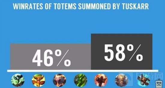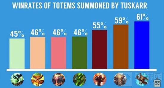 在统计的5000场数据中,海象人成功登场后获得胜利场次的百分比,可以看出最弱的是法伤图腾,而能带来最高胜率的是法力之潮图腾