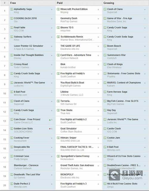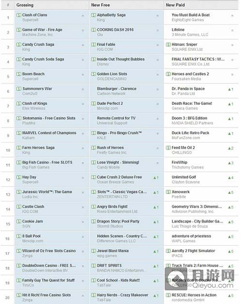 上周排名第六的《诸王争霸》(Clash of Kings)本周排名下滑一位,来到了第七名,而上周排名第七的《魔灵召唤》(Summoners War)则上升到了第六名。排在第八名位置上的依然还是《疯狂老虎机》(Slotomania),不过上周排名第九名和第十名的《大鱼赌场》和《卡通农场》本周则让位给了《漫威格斗冠军》(MARVEL Contest of Champions)与《农场英雄传奇》。
