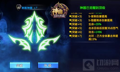 刺客,神器突破+7,光环:已方全体暴击率提高15%。