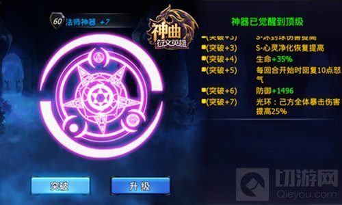 法师,神器突破+7,光环:己方全体暴击伤害提高25%。