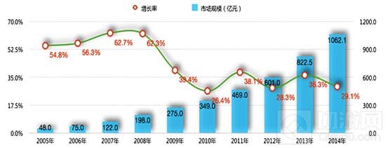 2005-2014年我国网络游戏市场销售收入规模