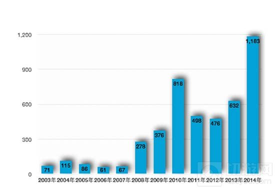 2003~2014年每年获取网络游戏运营资质的企业数量