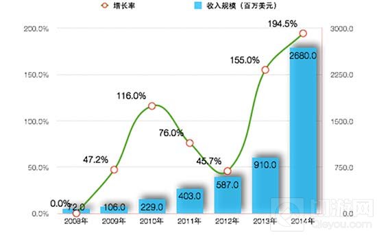 2009-2014年我国网络游戏出口收入规模