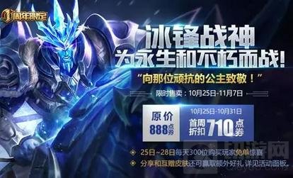 冰锋战神,为永生和不朽而战!关羽1周年限定史诗皮肤限时售卖持续至11月7日。喜欢的召唤师赶紧入手咯!