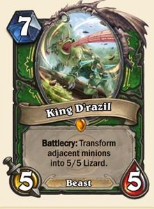蜥蜴王达拉兹尔 (猎人随从,野兽) - 战吼:将相邻随从变形成为5/5的蜥蜴。