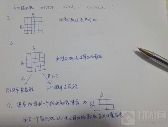 那么问题就很简单的,这场比赛可以看成一连串的矩阵博弈(好像是叫什么序惯博弈),根据矩阵博弈的结论,每一局必存在一个纳什均衡,在大多数情况 这个纳什均衡是混合的,也就说选手以某个概率掏出某个职业。在纳什均衡下,每位选手获得一个固定的胜率,因此以固定的概率进入下一个博弈,最后通过简单的加法和乘法就可以算出双方选手的胜率。为了便于理解,画个图说明一下,如果没有图那就是我忘了,我想以大家的聪明才智是可以自己画出图的。