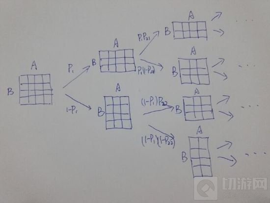 这个图比较简化,因为在每一步选手的职业是个混合策略,因为即使B以概率p1获胜,在下一步他的三个职业是有4种可能的(也有可能某个职业在策略里的比例是0 那就少了相应的一种情况),把p1乘以那个比例就得到了相应的确定的3职业对4职业的对阵,按照一样的方法往下做就好了。