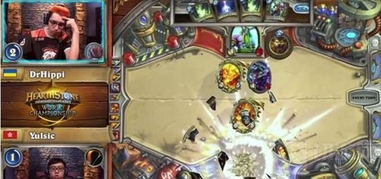 第一局Yulsic中速猎对阵DrHippi,双方起手都不错。在4费回合猎人上了两个蛤蛤,法师直接血法魔爆,猎人节奏开始落后。之后法师通过低费高效法术牢牢控住场面。