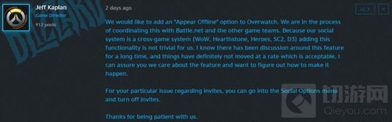 切游网的各位大神早,我是你们的老朋友绝世小侠,今天小编为大家带来了战网在线隐身功能的最新消息,很多玩家早就已经提出了这一功能的展望,不过暴雪爸爸迟迟没有给玩家答复,今天暴雪官方正式回复展望在线隐身功能已经在开放当中了~让我们一起来看!