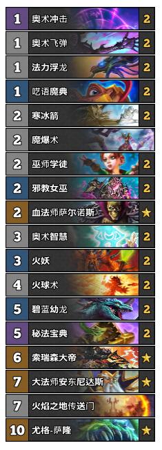本周节奏法雄踞T1并得到众多传说分段的玩家的选用。Asmodai携带了1张魔爆术来针对萨满和动物园并打到了传说第一,但他移除烈焰风暴这点我并不太赞同。我认为烈焰风暴替代一张火焰之地传送门能够有效提高对抗萨满和动物园的胜率即便是当前的天梯环境。烈焰风暴的作用正是作为你拍尤格萨隆前的救命稻草,不过我觉得有时早期输掉场面也不是一张烈焰风暴能扳回来的。