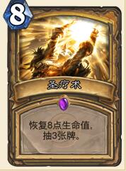 虽然有些对局它的存在有点多余,但针对大部分主流卡组来说,它真的太重要了!第一、它是过牌,第二、它能回血,第三、它是奶骑危急时刻自救的最佳方式;奶骑其实是一个算被动的套路,场面失控的时候是需要靠生平一套来清场的,但又经常会出现连招不到位的情况,而圣疗术的三张过牌恰恰极大的提高了组件凑成的可能性,即便拖了节奏又怎么样?对面肆无忌惮继续铺场,下回合直接全清返场的快感,有什么能够比得上的吗。