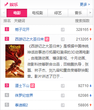纵观近期各类搜索榜,“大圣归来”的趋势犹如三伏天的温度节节攀升,正是由高路动画、横店影视、十月动画、微影科技等联合出品的一部国产动画电影《西游记之大圣归来》带来的这股“猴子热”。截止至今日,“大圣归来”百度搜索指数几近80万,且拿下搜索风云榜电影类排行第二名。7月16日,《西游记之大圣归来》官方宣布电影票房突破三亿大关,打破国漫最高票房纪录。