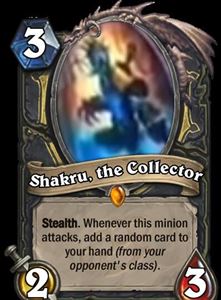 潜行。当这个随从进行攻击之后获得一张随机的卡加入你的手牌中。(来自于你对手的职业)