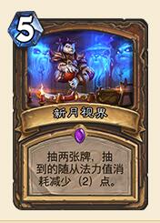 简评:新月视界是一张集过牌与减费于一身的法术牌,能够与随从较多的卡组(如科技德、野兽德等等)打出配合。自然,它的缺点也非常明显,那就是只能抽两张,属于上限很高,下限很低的那一种。如果玩家更加希望寻求稳定,不想因一点随机性而输掉对局的话,那么与其选择使用新月视界,反倒不如一张滋养要来得简单实在。