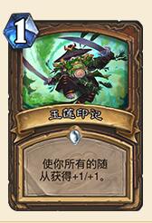 简评:玉莲印记就像是野性之力的改良版,虽然失之灵活,但却能够配合激活打出更多Combo。从1费约等于4点属性的卡牌模型来看,它只要给两个随从+1/+1就算不亏,而德鲁伊想要铺到三个随从并不困难,超生德更是能够轻轻松松达到四个以上。可以想象的是,今后超生德极有可能将加入玉莲印记,带上野蛮咆哮,力图在前期快速铺场后带走对手。就算是继续坚定走中速偏慢的路子,额外两张群体Buff卡也能降低卡组容错率,让超生的Combo更容易达成。