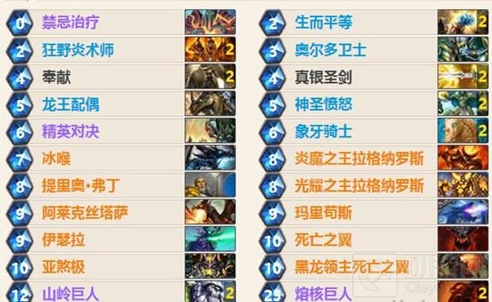 2.象牙骑士、光耀领主拉格纳罗斯、精英对决、冰吼、禁忌治疗的加入,使元气骑增加了奶量和中期解场能力,特别是象牙骑士,如果提供第三发元气弹,或者在对阵死鱼骑时给一发王者归来,都大大增加了赢面。在OTK卡组普遍削弱的当前环境,11血以下上熔核巨人combo紧急治疗,相当于第二发光螺丝,可以强势反场。