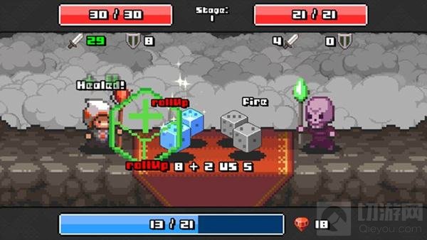 游戏风格与《骑士连战》比较相似,都是采用了像素风格的横版 1V1 战斗方式。游戏中玩家可以通过投放骰子来进行战斗,根据骰子上总和数不同而决定谁先谁后,骰子的数字甚至是玩家的攻击值,可以说是运气成分比较高。当然游戏允许玩家重新投放骰子,算是减少了运气对游戏的影响。