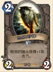 恐狼:其实恐狼存在意义和叫嚣是一样的,都是用来加成buff的,达成以小换大的需求的。但是考虑到恐狼这种随从在单独上场之后身材属性严重不足,因此这种卡牌也只能带上一张。