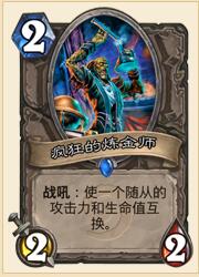 炼金师:炼金这张卡牌倒是非常切合环境的一张卡牌,现今天梯前三的卡牌是萨满、战士、德鲁伊。炼金在面对这三个职业的时候都有很好的作用,萨满的图腾,德鲁伊的大树、大蓝龙,战士的苦痛、大随从,这些在我们没有沉默的情况下,都可以依靠炼金来解决。甚至强如滑行者也在炼金的针对范围。另外炼金的特效不仅仅针对对手,还能针对自己,加强斩杀的攻击力,灵活使用的炼金作用还是比较大的。炼金带1张还是2张比较看环境,毕竟裸上是一个很亏的随从,所以大多数的卡组中都是选择带一张。