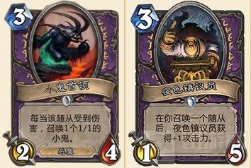 夜色镇、小鬼首领:这两张牌应该算得上是三费数一数二的卡牌了。议员的高血量成为了抗衡AOE的最佳选择,特别是在面对萨满的时候,3费的议员是足够让萨满头疼的一张卡牌,它不是能够轻易解掉的卡牌。而小鬼首领同样也是能够对抗AOE的,因为它受伤能够召唤小鬼的buff,使得我们不会那么轻易就被清场了。所以在对阵萨满的时候,这两个随从应该尽可能在3费丢上场面,如果在上两个随从和上一个夜色或者小鬼上面选,那么肯定选夜色或者小鬼。