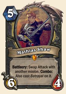 马迪亚斯. 肖尔 (潜行者职业橙) - 战吼: 与另一个随从交换攻击力。连击:同时对该随从释放“背叛”。