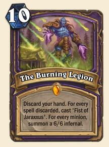 燃烧军团 (术士法术橙) - 丢弃你手中的卡牌,每丢弃一个法术变释放一次“加拉克苏斯之拳”,每丢弃一个随从召唤一个6/6的地狱火。