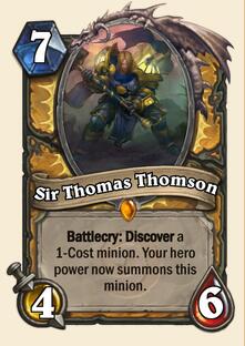 汤姆森 (圣骑士职业橙) - 战吼:发现一个1费的随从,你的英雄技能现在将会召唤这个1费随从。