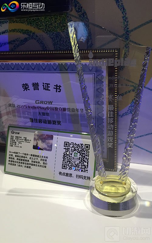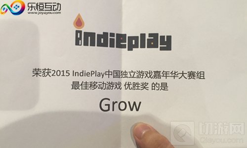 2015“IndiePlay中国独立游戏颁奖典礼”正式落下帷幕,备受业界关注的中国独立游戏大赛的获奖名单火热出炉,由国内游戏制作人陈虹曲制作,新锐游戏公司乐恒互动投资孵化的独立游戏《Grow》凭借其独具魅力的游戏画面,新奇的游戏玩法,静谧典雅的音乐,获得了最佳移动游戏、最佳游戏两个重要奖项的提名,并最终斩获了最佳移动游戏大奖!