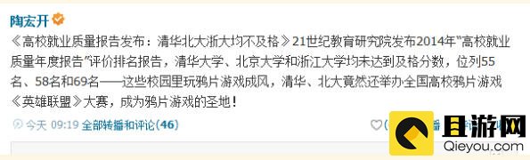 陶宏开教授日前发表微博,称近期发布的2014年“高校就业质量年度报告”中显示,清华、北大和浙江大学均未达到及格分数,究其原因,竟然是因为这些大学举办英雄联盟的高校联赛导致的。