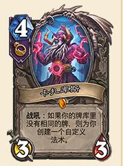 卡札教主 :极强的一张卡,对局势判断和对方卡组熟悉程度要求很高。大部分时候你都希望全场AOE,全场变羊(对宇宙术和青玉德等),抽牌。加甲和直伤有时也很有用,比如10费8伤解螺丝。对抗快攻多建议1费或5费,而对青玉德宇宙术等则多建议10费法术。