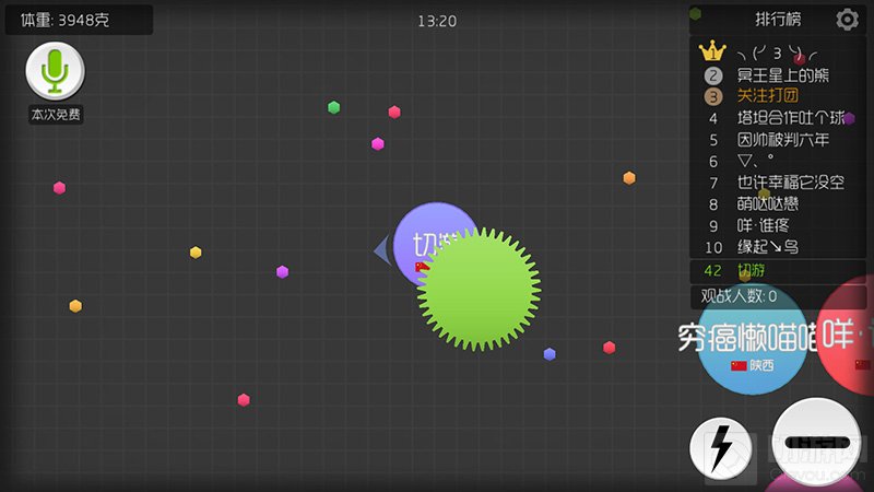 5、可以点右下角的闪电,喂养绿色带刺的障碍物,到一定大小后会朝你的那个方向分裂障碍物去打击比你大的球。