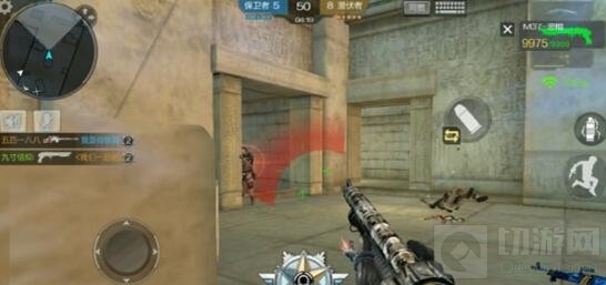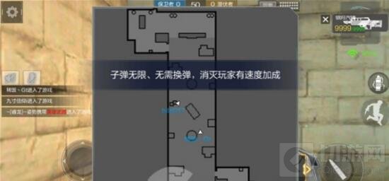 进入无限火力模式之前,我们先来了解一下地图的构造,雷达显示整个地图类似‘Z’形,玩家出发在上下两端,在中央摆设了些许的柱子和箱子,进攻路只有中间这一条,虽然地图范围不算大,但是玩法奇多,走位的路线也较多,例如围绕柱子来打游击,石块后面蹲守,使用狙击枪在家中狙击,等等。