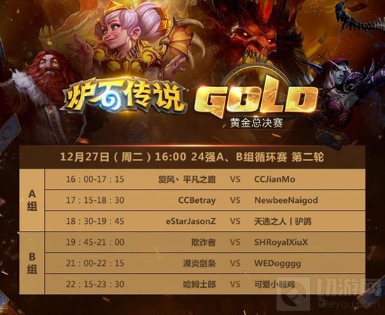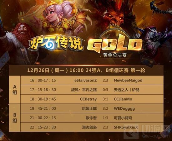 2016《炉石传说》黄金总决赛于12月26日正式拉开序幕,首日进行了小组循环赛A、B组第一轮的比赛(各3场)。刚刚在《炉石传说》全明星赛中夺冠的eStarJasonZ以2:3的比分惜败于NewbeeNaigod,其双人现开赛的好搭档可爱小弱鸡则3:1轻取欺诈者。