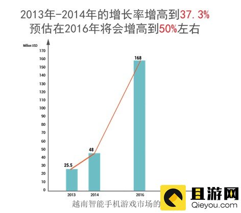 此增长速度已经大于越南游戏增长速度的3.5倍(越南游戏市场增长速度是10.6%),预估到2016年,越南手机游戏市场的营业流水将会达到5.2千万美元。