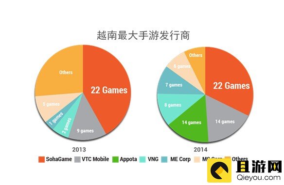 2013年SohaGame发行了22款手游,VTC Mobile 发行手游的数量是9款,MC Corp是5款,VNG是3款,最后ME Corp是发行了1款。2014年SohaGame持续保持首席的位置,发行了22款手游,