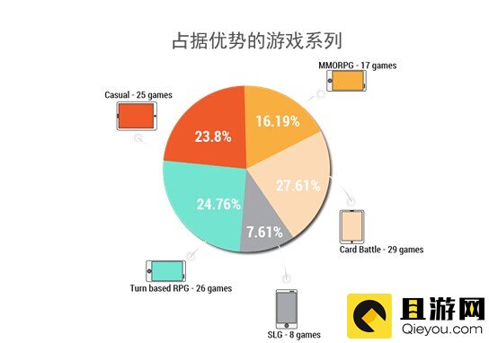 2014年,卡牌游戏 (Card Battle)占据游戏市场最大的比率:27.61%,RPG回合制(回合制角色扮演)占24.76%,休闲游戏(博弈游戏)占23.8%, MMORPG (大型多人在线角色扮演)占16.19%,最后是SLG(策略游戏)是7.61%。
