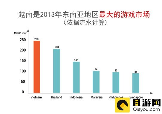 根据市场研究顾问公司Newzoo,2013年越南已经成为世界TOP25获取最高营业流水的游戏市场之一。总营业流水达到2.33亿美元,依据营业流水来计算,越南游戏市场就是东南亚区域最大的市场,并且在亚洲地区排名第6,仅次于中国,日本,韩国,台湾和印度等市场。