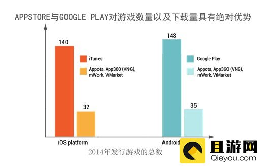 Apple的App Store 与 Google 的 Google Play 这两个官方应用商店对于游戏数量和下载用户总数具有绝对优势。2014年,iOS操作系统上iTunes应用商店已经推出140款产品。而同一时间Appota, App360, mWork, ViMarket一共只推出32款产品。同样的情况,Android操作系统上,Google Play发行了148款产品,Appota, App360, mWork, ViMarket 一共发行了35款产品。