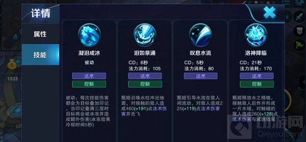 凝泪成冰(被动):每次技能伤害都会为目标叠加印记,当印记叠满三层时目标将会被冰冻并造成额外伤害。被动是甄姬的核心,既能控制敌人又能打出额外的伤害。由于需要技能伤害才能触发,因此技能的命中非常关键。