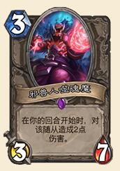 邪兽人:为什么带上这张卡牌,主要是为了增加在面对慢速卡组的过牌能力,慢速卡组前期不容易对我们的随从造成伤害,那么自然也就限制了我们的过牌,而邪兽人的加入使得我们可以主动受到伤害,这样我们就可以在对方不主动的情况下去过牌,另外邪兽人自身的血量他是7点,在配合猢狲医者之后也是一个能够完成28点的伤害的随从。并且可以不用沉默,所以综合考虑带上了这张卡牌。