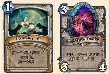 盾+鸦人:这套组合就是增加血量的组合,盾的是最优质的卡牌,过牌和血量的增加。鸦人的存在是为了堆高血量,当鸦人和傻子搭配后,我们在辅助以5费的buff能够完成32点血量的斩杀。并且在费用上并不需要很多。而且在平时也能够认为的造出高血的随从,并不是一定需要利用两个傻子来做文章。这样也是变相增加了我们其他斩杀的可能性。