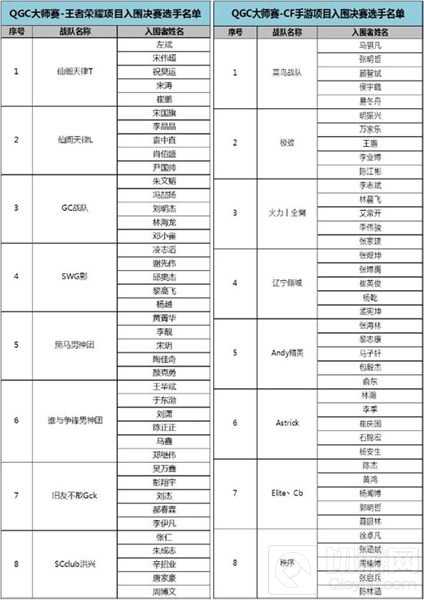 随着2015年QGC赛事点燃了移动电竞行业的一把火,大大小小的手游赛事顺势在国内火爆起来。近日QGC大师赛官方正式公布了入围决赛的16支战队名单。QGC大师赛总决赛将于4月29日-30日在厦门国际会展中心进行,届时将进行“王者荣耀”、“穿越火线:枪战王者”(又名CF手游)两款游戏的全国总冠军争夺。