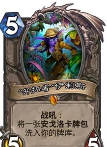 首先当然是这次的焦点牌,伊利斯·逐星哦不对是“开拓者”伊利斯,这张牌可是我们的老朋友了,因为LOE的成功原创角色,加上玩家们的好评,用这个角色来带领玩家们进入安戈洛这个地区固然是最好的选择。首先这张牌的身材不算差,然后效果是将一张安戈洛卡牌包的卡插入卡组。在逐星退环境之后,这张牌绝对能代替逐星的地位,毕竟也是防战,拖疲劳的神器,而且这样我们也能在游戏中体会到开包的乐趣了。BB说你们喜欢开包我懂得。(因为这感觉很COOOOOOOOOOOOL~~~)所以说,这张卡中后期卡组都可以一试,毕竟,免费的补充手牌,谁不要呢?而且一张等于五张。太爽了不是么?对比王子,王子是谁?当然不排除脸黑蓝天白云的情况。最新人品测试器。。。