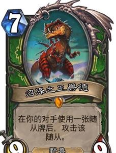 接下来就迎来了据说的猎人最强版本的猎人的橙卡,哎,你还别说,还真的可以用。在很多优质橙卡退环境之后,猎人这个799也有了一定的用武之地,首先身材肯定是不错的,然后效果是在对手使用一张随从牌后对该随从攻击,也就是说你在猎人出这牌之后出牌,除非比这牌身材好,否则就是白吃。下一个死一个,或者人海战术弄死这个暴龙。但是即使杀了这个龙估计费用也就少了很多吧。所以说,这是一张类似于奥秘一样的牌。可以在对方回合影响他的铺场。在猎人有场面之后,下这张牌,是一种可以伪保场面的办法,解不掉,下轮就是一脚。但是注意的是,应该是没办法对衍生物攻击的,例如青玉之灵召出来的青玉魔像。所以,青玉还是爸爸~毕竟魔像是女孩最喜欢的玩具。