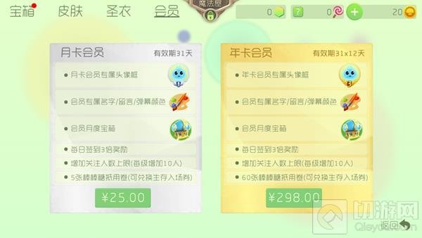 在魔法屋中点击会员,进入会员购买界面。会员分为月卡会员和年卡会员两种,月卡是25元,年卡是298元。如果你想要购买其中的一种,请点击下方的按钮即可购买。安卓玩家可以通过银行卡和支付宝来购买,iOS玩家只能通过苹果账号购买哦。