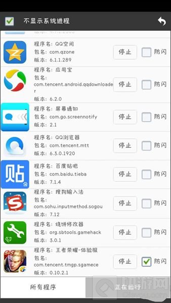 1、后台运行这两个软件,打开王者荣耀体验服,在他还是竖屏的时候(关键点),打开晃悠,打开游戏防闪,在正在运行中找到王者荣耀体验服,勾选防闪。