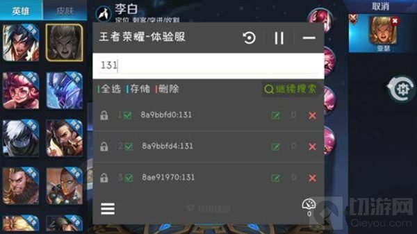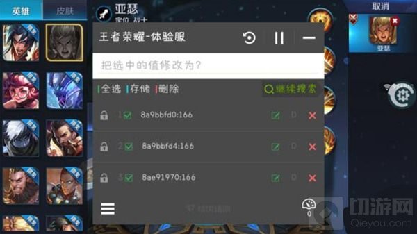 3、在点击亚瑟,搜索166,搜索出几个数值,将他们的锁头点亮,然后输入数值131,这就是李白的代码,随便点一个别的英雄,再点亚瑟,这时我们会发现亚瑟的技能和语音包都换了,这就是李白了,进入游戏,就是李白。