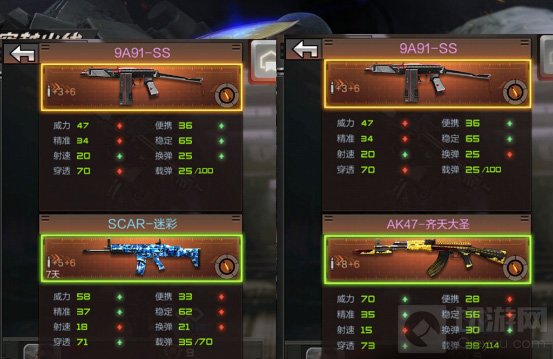上图通过对9A91-S和9A91-SS分三组进行对比,满精通-S与零精通-SS;满精通-S与满精通-SS; 满精通-SS与零精通9A91-S。三组对比可以看出,更是突出9A91-SS的枪械的一些属性。