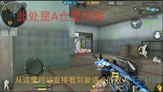 此处是A仓库,仓库里面的拐角位置。从拐角位置我们可以直接看到敌人复活点的位置。反之敌人也能看见我们,所以我们在进A仓库的时候要格外小心。