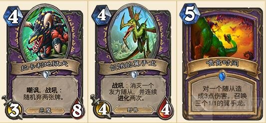上个版本,猎人很容易能够拿到一批优质的职业低费随从,而现在他则只能获得部分野兽,除了雷鸣刺吼龙和宝石鹦鹉,真正赚的不多。当然,凶恶的雏龙很适合猎人,问题它不是职业卡,不会受到竞技场职业卡出现率提升的BUFF,所以猎人并不比其他职业容易拿到他。